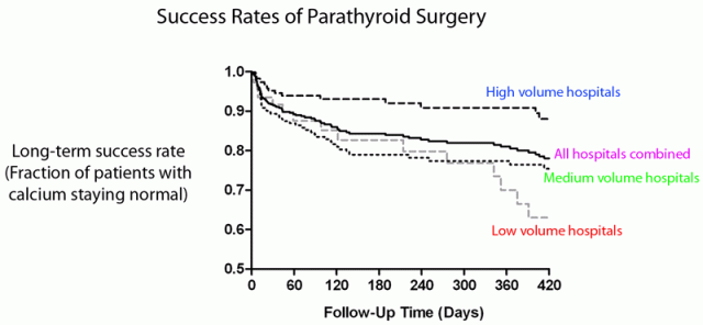 Now, you might be surprised to learn what counted as a high-volume hospital in this study. The typical high-volume hospital in this study performed an average of 15 parathyroid operations per year. What does this mean? Well, two things. First, most parathyroid operations are straightforward and can be completed with an excellent success rate by surgeons who perform parathyroid surgery more than once per month. Second, the role of the expert parathyroid surgeon is to raise the success rate from 90-95% long-term to 97-99% long-term. (Claims of success rates greater than 99% have not been confirmed by independent, third party audit.)