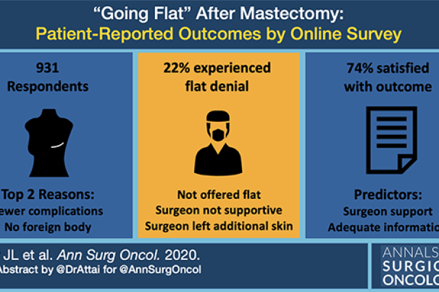 Attai and her team found that a majority of patients who elected to go flat were in fact satisfied with their surgical outcome. The authors believe the survey tool commonly used to asses outcomes was biased towards reconstruction. To avoid that bias, Attai partnered with patient advocates to develop a unique survey to assess reasons for going flat, satisfaction with their decision, and factors associated with satisfaction. They also identified concerns unique to these patients not captured by other validated surveys.